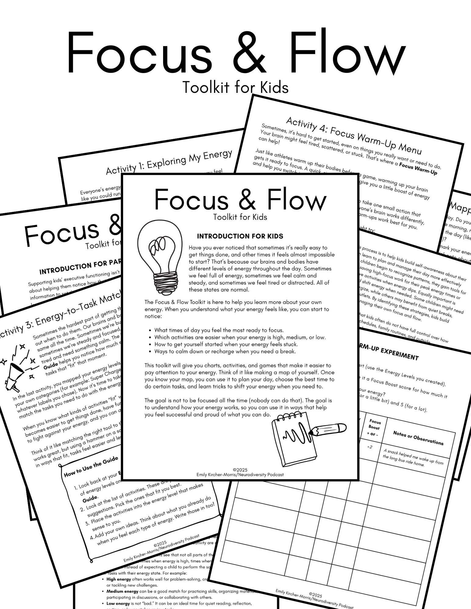 The Focus & Flow Toolkit for Kids gives parents and caregivers simple, kid-friendly tools to help children notice their natural rhythms and learn ways to focus or recharge when they need to. You’ll find easy-to-use charts, reflection prompts, and activities that build self-awareness, focus, and confidence.
